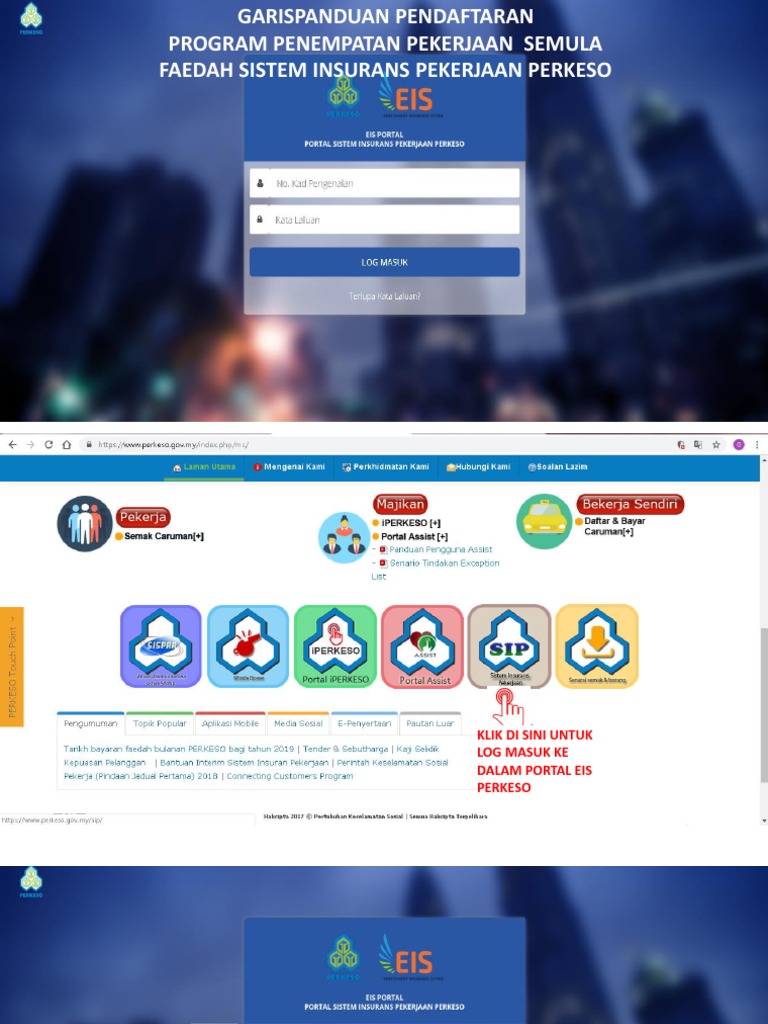 .program penempatan pekerjaan semula, ob perlu mendapatkan kata laluan seperti slip permohonan dibawah setelah membuat permohonan faedah sistem insurans pekerjaan (sip) *rujuk tatacara permohonan tekan kemaskini profil. Antara manfaat yang ditawarkan oleh sip / eis untuk melindungi kepentingan pekerja adalah : Peluang untuk penempatan pekerjaan dengan syarikat pengurusan fasiliti (fm) selama tiga (3) bulan/lebih. Program penggajian dan penempatan semula pati (program rehiring). Di bawah inisiatif ini dengan mengekalkan pekerja yang terlatih dan berpengalaman, syarikat mudah bangkit semula.