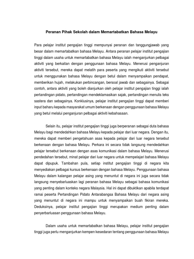 Peranan Pihak Sekolah Dalam Memartabatkan Bahasa Melayu from imgv2-2-f.scribdassets.com Tujuan utama memartabatkan bahasa melayu adalah kerana bahasa melayu merupakan bahasa kebangsaan yang menjadi alat perpaduan, bahasa perhubungan utama dan bahasa ilmu ke arah membina negara bangsa untuk mencapai hasrat 1malaysia. More images for cara untuk memartabatkan bahasa melayu » Mar 30, 2021 · isi 1. Aug 20, 2014 · semua pihak perlulah bekerjasama untuk memartabatkan bahasa melayu sebagai bahasa rasmi dan bahasa kebangsaan. Tindakan ini sewajarnya diimplementasi di setiap peringkat daripada jabatan kerajaan, agensi, kerajaan negeri, pihak berkuasa tempatan hingga ke jawatankuasa kemajuan. Dicatat oleh cikgu anelyza di 5:53 pm. Sepatutnya kerajaan mewajibkan semua sektor baik kerajaan mahupun swasta untuk menggunakan bahasa melayu. Nov 21, 2010 · cara itulah yang terbaik untuk memartabatkan bahasa malaysia yang ternyata memberikan faedah yang besar kepada perpaduan rakyat dan teknologi malaysia.
